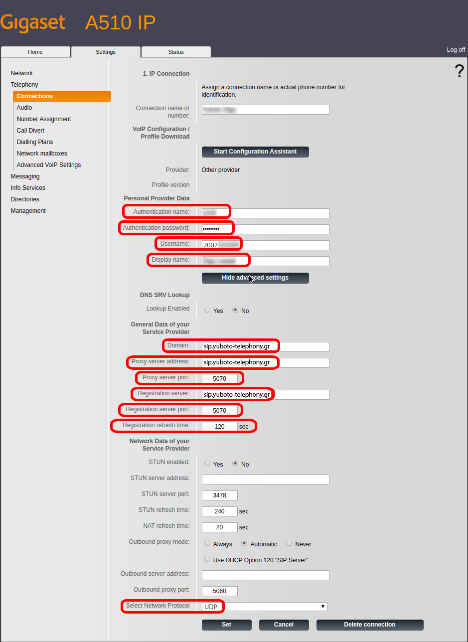 - Επιλέξτε την καρτέλα Telephony και μετά Connections. Πιέστε το πλήκτρο Edit δίπλα από κάποια σύνδεση voip και συμπληρώστε τα παρακάτω στοιχεία: